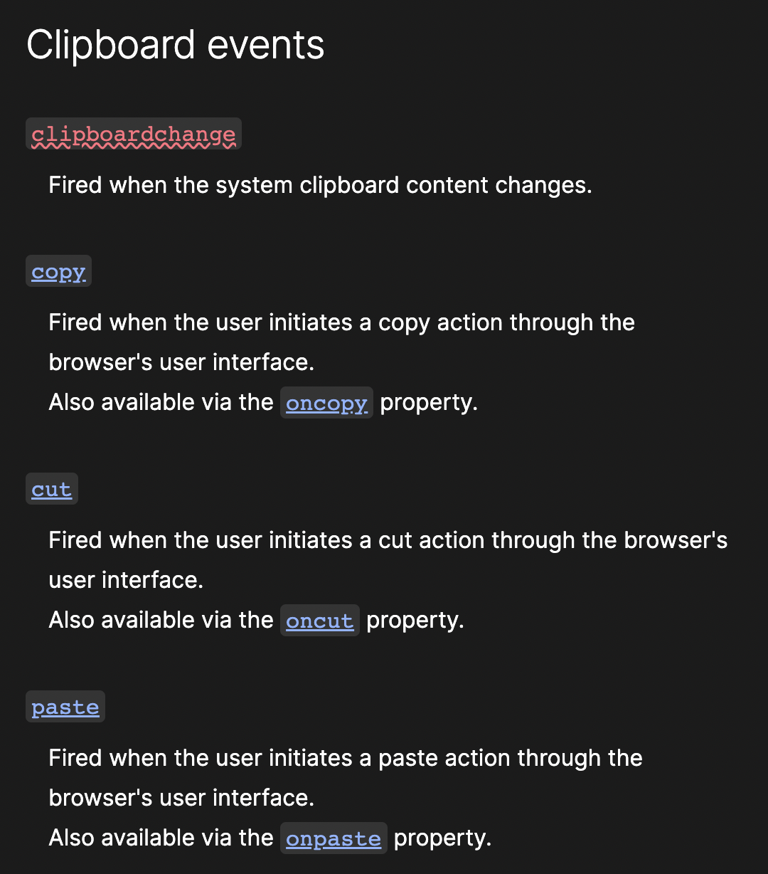 We can find any events in this web page. I want to know 'Clipboard events' something like copy, ....