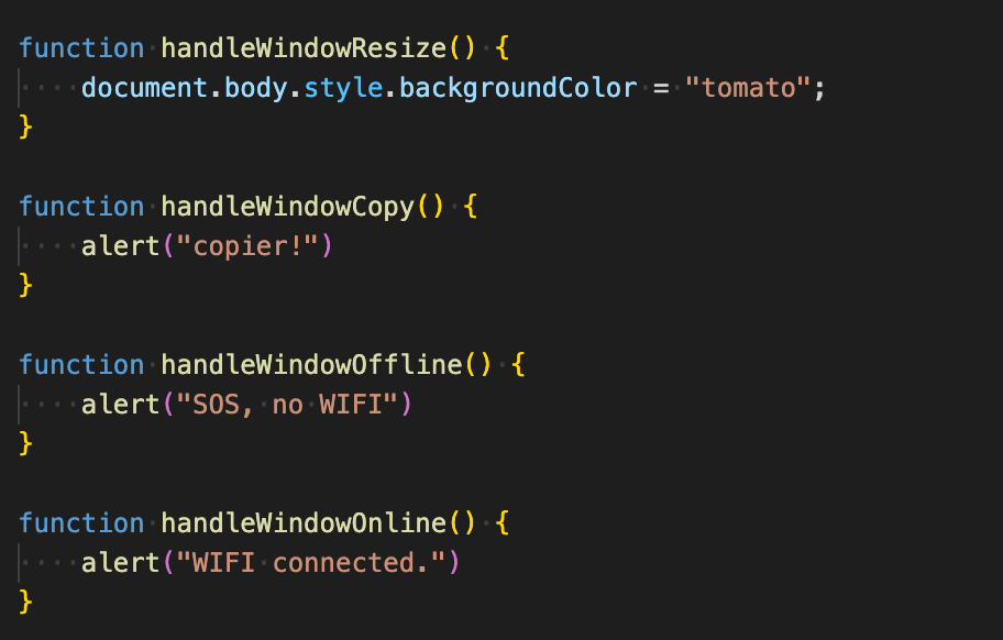 I want to know how to handle 'Events on Window' by JavaScript. Search "Window mdn" on google web site. I can see one web site, Window mdn (Web API).