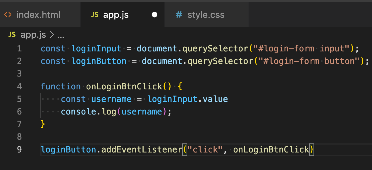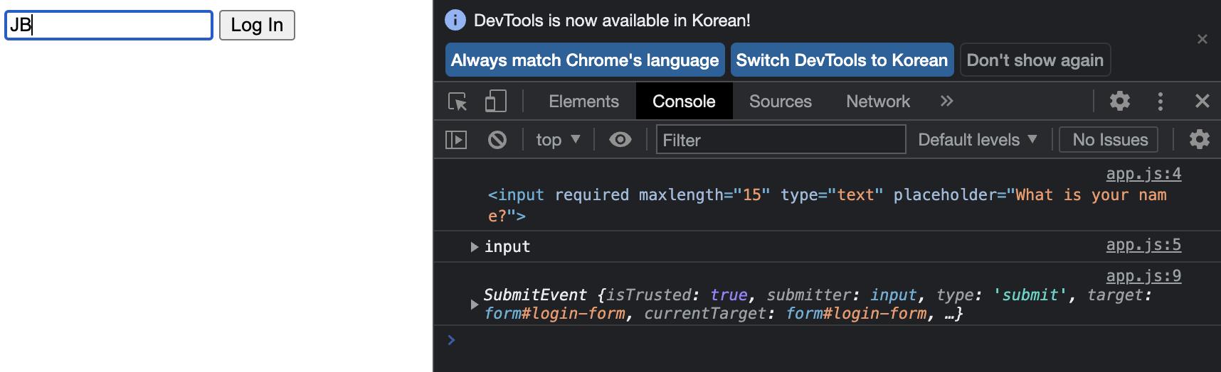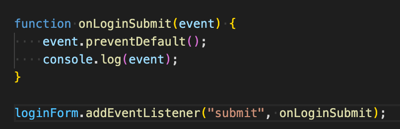 가령 아래의 코드에서는 function onLoginSubmit() {} 이었던 것에 argument 를 추가하여 정보를 받아들이는 것이다. function onLoginSubmit(tomato) {} 이렇게 코드를 작성할 경우 해당 함수가 호출되는 지점, 즉 어떠한 event 가 일어난다면, 그 순간 해당 event 에 관한 정보가 EventListener의 함수인 onLoginSubmit 함수의 첫 번째 argument인 tomato 에 들어가는 것이다.