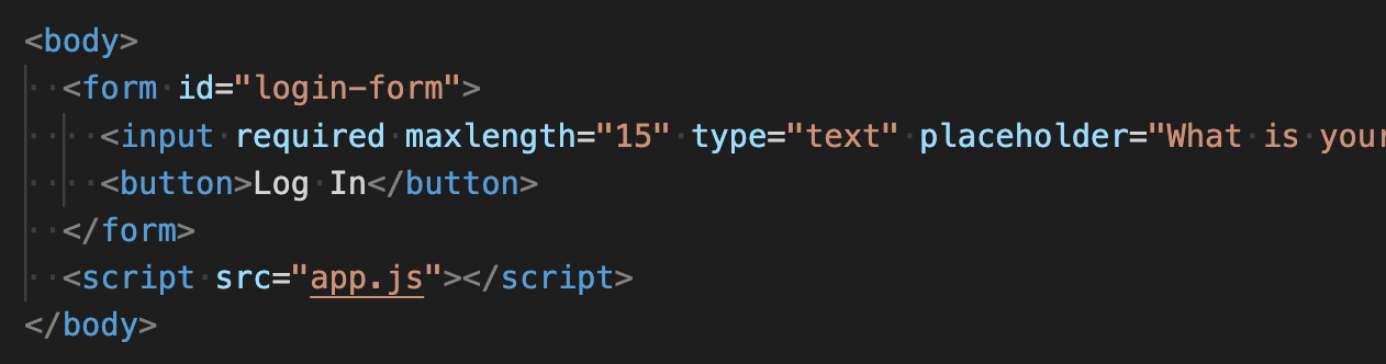 <input> 에는 미리 정의된 required, maxlength 등을 활용할 수 있다(내가 이 기능을 직접 구현하지 않아도 됨. JS에서). 유효성 검사[Validation]을 하기 위해서는 <div> 가 아닌 <form> 내부에 있어야 유효성 검사 기능을 비롯한 HTML의 도움을 받을 수 있다.