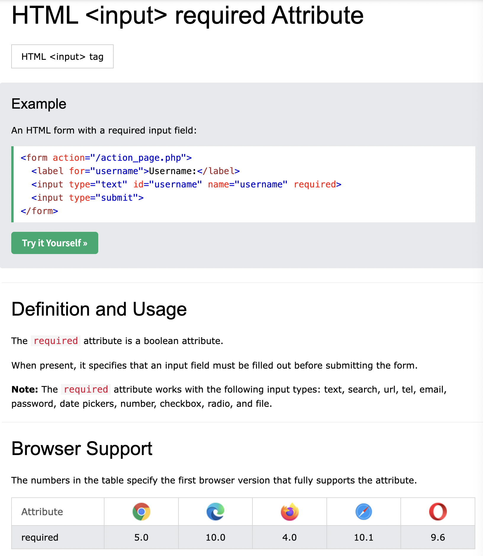 <input> 내의 required 라는 Attribute 는 브라우저가 제공해주는 기능이고, 이 브라우저가 제공하는 기능을 이용하기 위해서는 <input> 을 <form> 타입에 엮어야 한다.