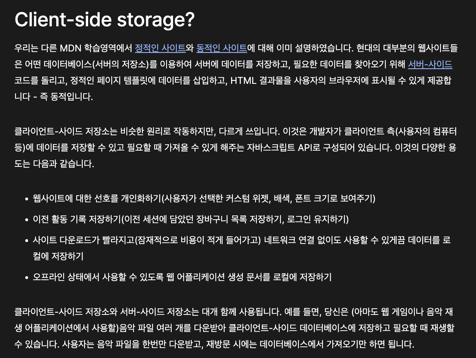 https://developer.mozilla.org/ko/docs/Learn/JavaScript/Client-side_web_APIs/Client-side_storage