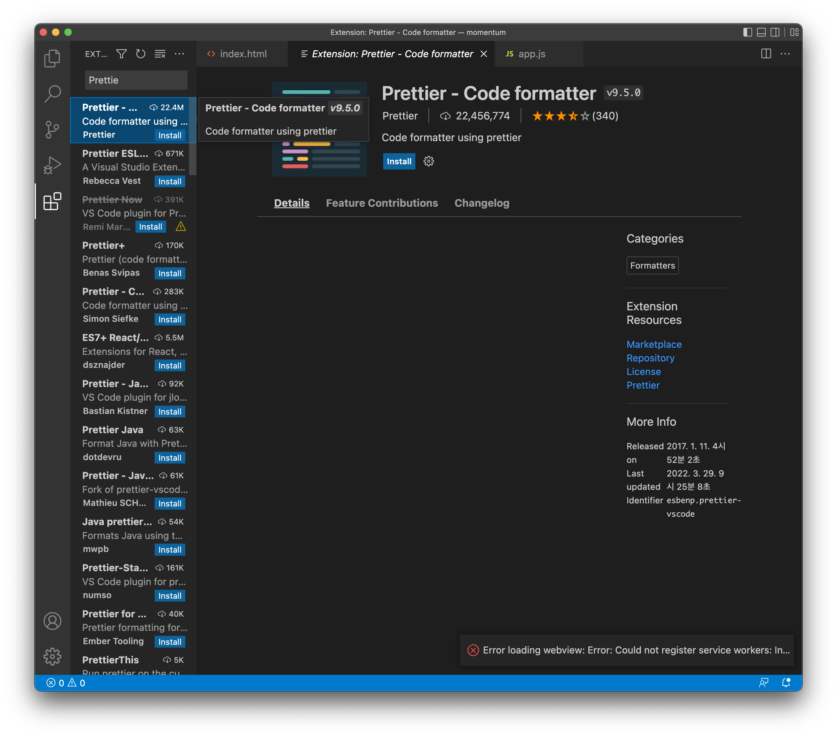 ㅂ 나는 현재 Java Script 공부를 시작하는 단계인데, Visual Stuido Code 툴을 이용해서 공부하고 있다. 노마드 코더 니콜라스 쌤의 수업을 무료로 수강 중인데, 그 안에서 Prettier 언급이 있었다. 쉽게 말해서 코드에 띄어쓰기나 ';' 삽입이 제대로 되어있지 않은 상태에서 세이브 단축키를 누르면 포맷이 자동 정렬된다는 것이다. 소소한 데에 에너지를 뺏기면서, 스트레스를 받지 않고자 경험을 해보고자 설치해보기로 했다. Extension 창을 열어준다. 단축키는 Cmd + Shift + X 다. 그게 아니라면 왼쪽 사이드바 탭 안에서 가장 아래에 위치한 테트리스 블럭을 클릭한다. 그리고 Pritter 를 검색한다. 그러면 여러 가지가 나오는데, 우리는 여기서 Prietter - C..